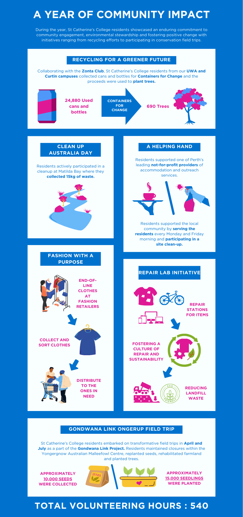 During the year, St Catherine’s College residents showcased an enduring commitment to community engagement, environmental stewardship and fostering positive change with initiatives ranging from recycling efforts to participating in conservation field trips.